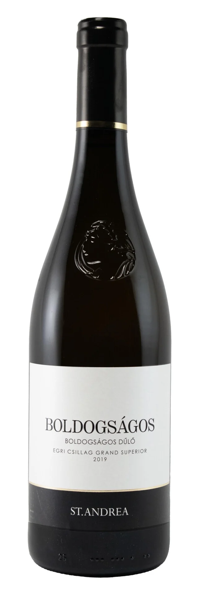 Meet the St. Andrea Boldogságos, an excellent white wine from the famous Hungarian region of Eger. Located in the heart of Hungary, Eger is renowned for its rich wine tradition and beautiful vineyards. This historic city, over a thousand years old, is often mentioned in the same breath as the prestigious Burgundy in France, due to its ideal climatic conditions and the high quality of its wines. Eger, with its baroque old town, spa resorts, and picturesque vineyards, is a beloved destination for wine enthusiasts. The St. Andrea Boldogságos is made from a unique blend of four grape varieties: Sauvignon Blanc, Viognier, Olaszrizling, and Szürkebarát (Pinot Gris). This results in a complex and well-balanced flavor. The Sauvignon Blanc brings fresh citrus and grassy aromas, while the Viognier gives the wine a floral and fruity dimension. Olaszrizling contributes subtle minerality, and Szürkebarát adds a light spiciness, giving the wine its characteristic, unique flavor. The fermentation of this wine takes place in large oak barrels, a traditional technique that adds extra depth and complexity to the wine. The use of oak ensures that the wine acquires subtle woody notes without overshadowing the other aromas. This carefully managed process creates a harmonious balance between the fresh fruity flavors and the rich, woody nuances. With an alcohol content of 13%, the St. Andrea Boldogságos is a wine that perfectly combines strength and refinement.